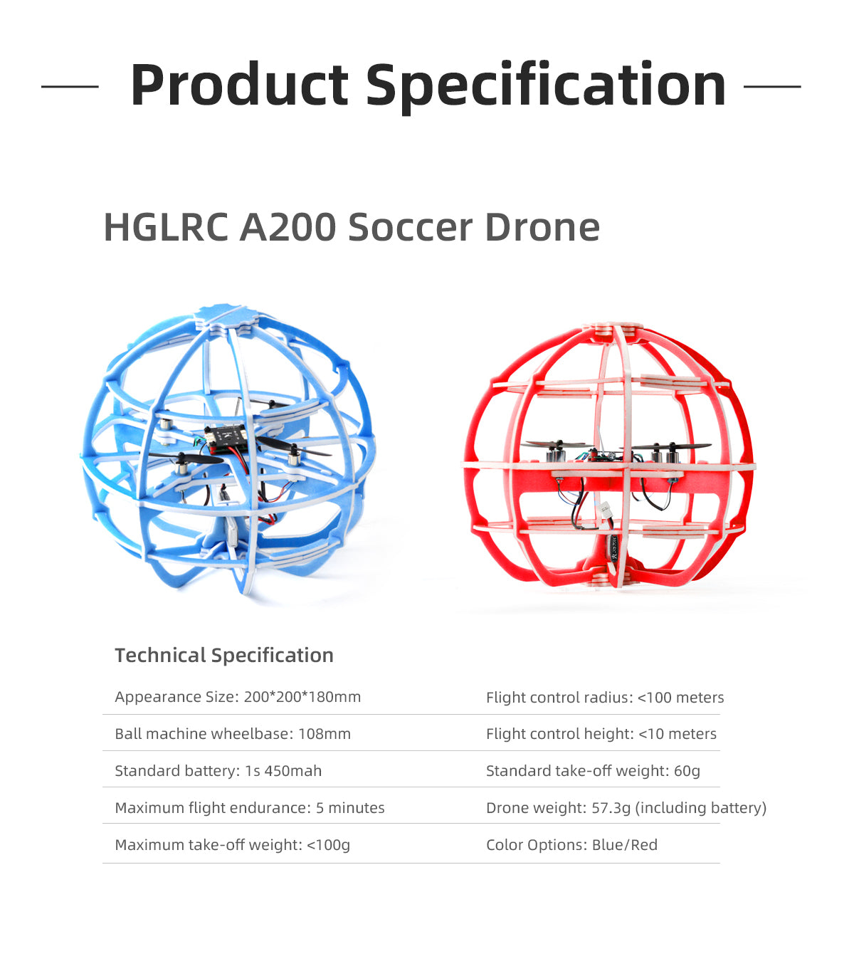 HGLRC A200 Soccer Drone is a combination of drone and football appearance. There is an integrated protective cover on the outer surface, which is not easy to break even if it is hit or rolled over. The battery is designed with an ultra-low center of gravity and has a tumbler effect.